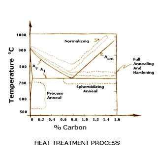 Stress relieving is done by subjecting the parts to a temperature of about 75 ºC (165 ºF) below the transformation temperature,line A1 on the diagram, which is about 727 ºC (1340 ºF) of steel—thus stress relieving is done at about 650 ºC (1202 ºF) for about one hour or till the whole part reaches the temperature. This removes more than 90% of the internal stresses. Alloy steels are stress relieved at higher temperatures. After removing from the furnace, the parts are cooled in still air.